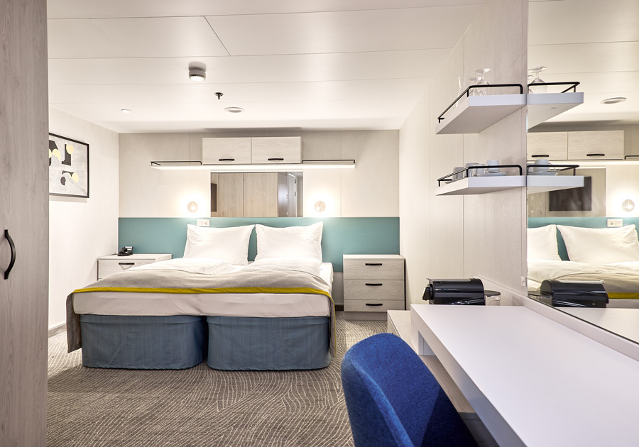 Ausstattung aller Kabinen: Espresso-Maschine (1 Kaffeekapsel pro Tag und pro Person ist inklusive), Bademantel, Slipper, Klimaanlage, TV, Safe, Telefon, Bad mit Dusche/WC und Haartrockner. Die Betten können auf Wunsch zusammen- oder auseinandergestellt werden.