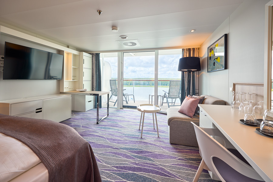 - Übersee Suite (40 m², Balkon 9 m²): Viel Komfort und ein toller Ausblick vom Balkon erwartet euch hoch oben auf dem Schiff (Deck 14 in der Nähe vom Bug).